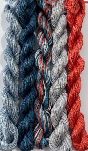 The variegated colour in this pack is the same as our PR1953 along with a matching solid of Soft teal blue, deep teal, silver and rusty orange. These skeins are available to be purchased individually.