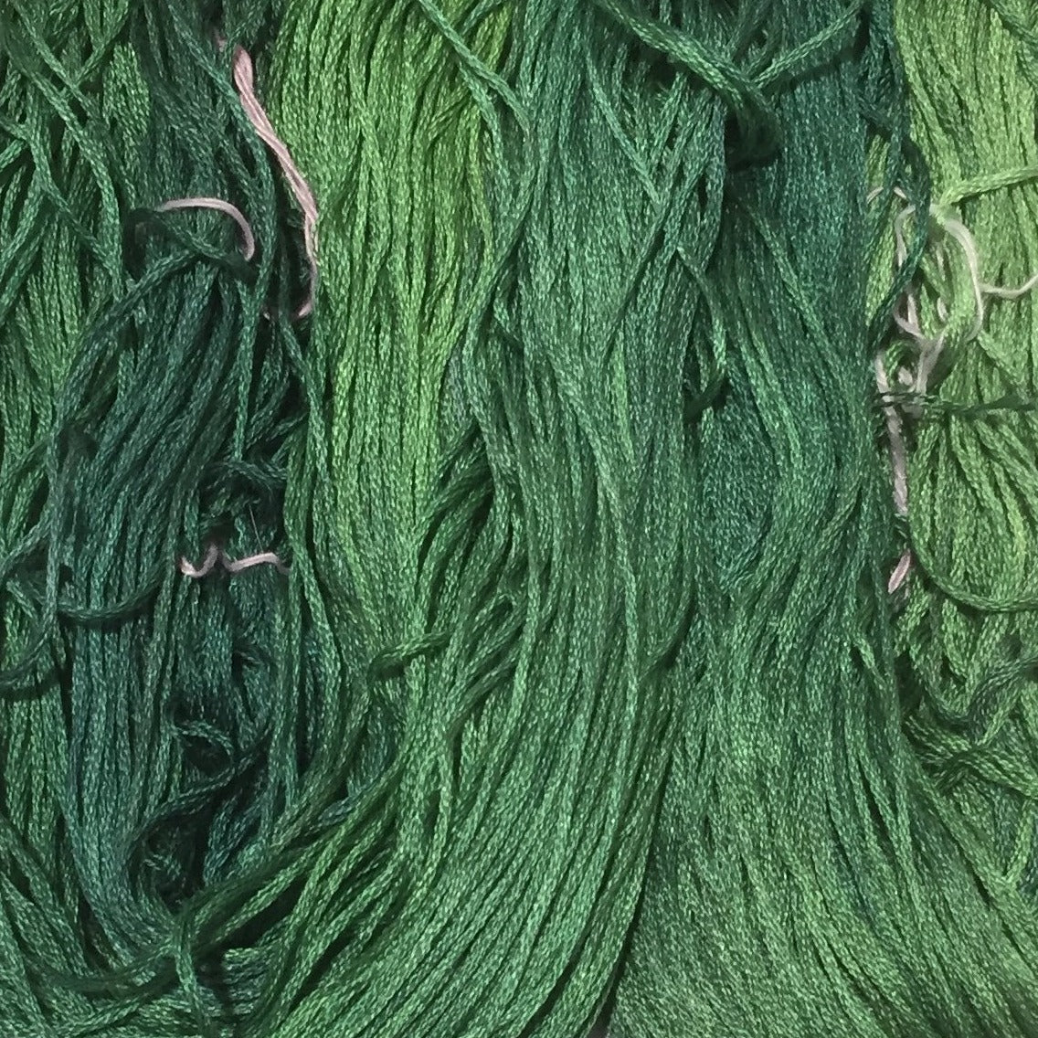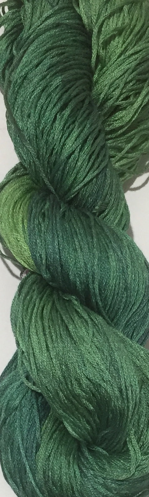 This hank is a combination of different greens. Because this silk is so shiny, the differences in colour are often exaggerated in the photo. If you have any questions, please ask.